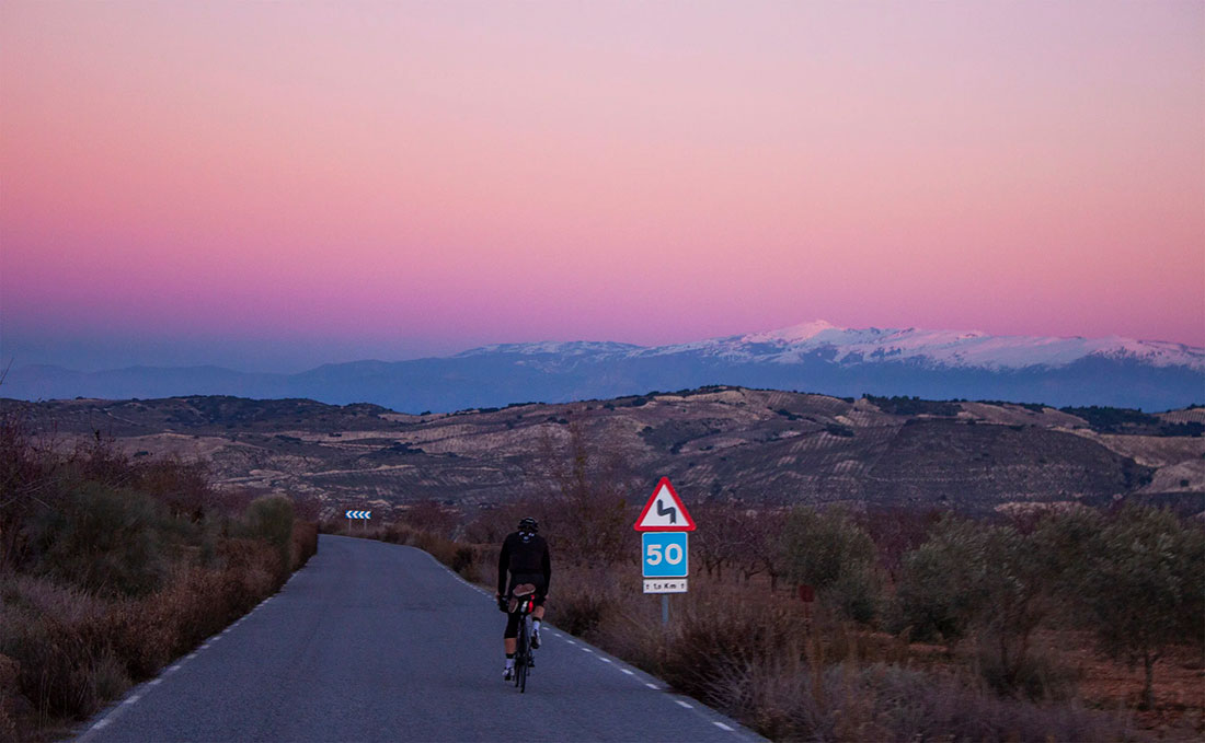 We stopped for lunch in the small village of Riogordo, where options were limited and our choice fell on a little shop that made bocadillos. Enjoying delicious Spanish ham and cheese, we sat in the shade and felt our legs tickle, just a little. But on we went, and we spent the rest of the day climbing. On the second last climb at Puente Alhama, which Laurents ten Dam last year climbed at double our speed, the sun set on us. The sky filled with pink-red over the mountain ranges, and we took in one of the dreamiest sunsets we have ever seen on the bike. We got on our long sleeves and legs, and turned on our lights. From here on, we were in the dark. Two hours out from Granada.